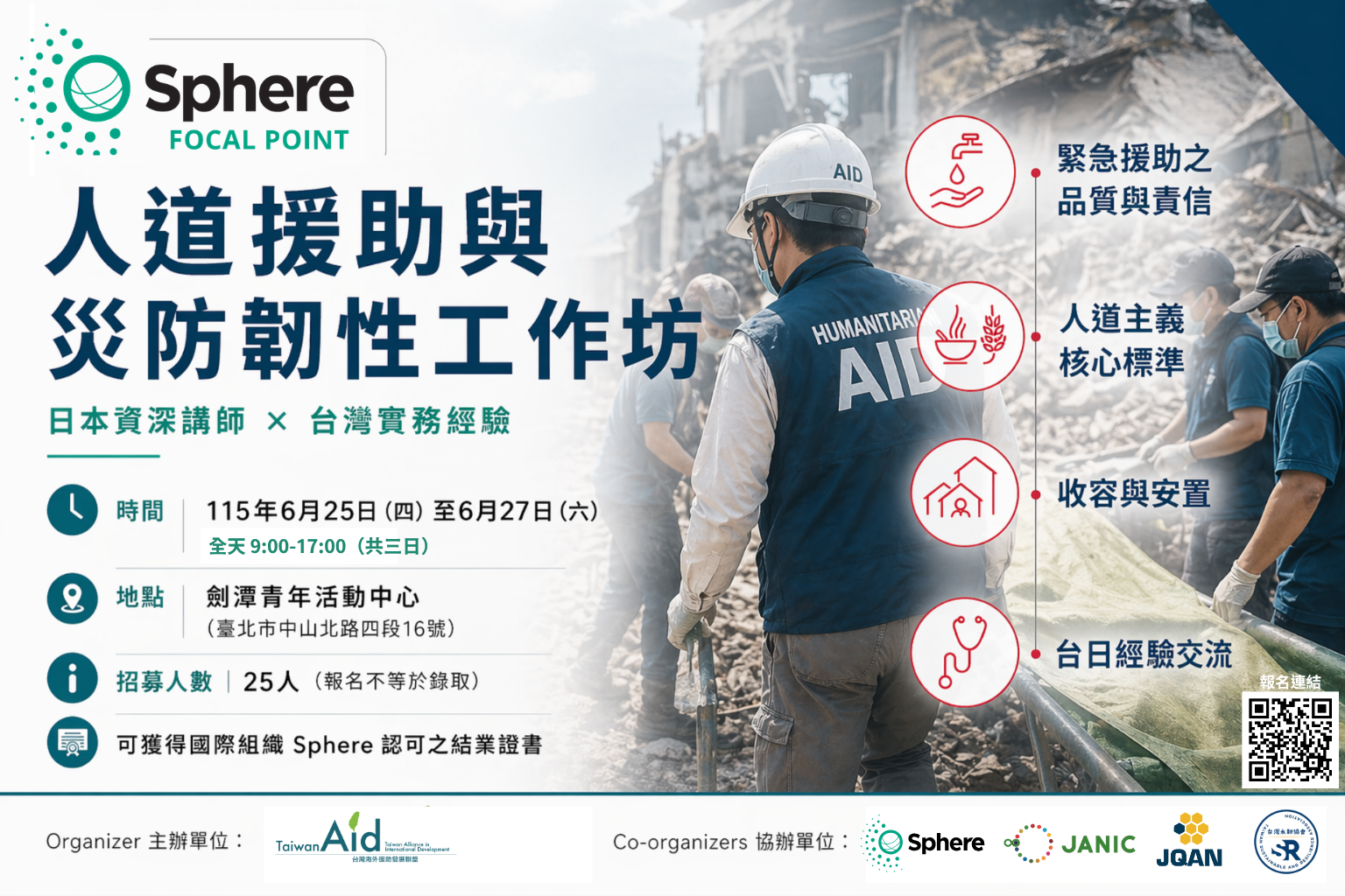 - 協辦單位:Sphere, Japan NGO Center for International Cooperation (JANIC), Japan Quality and Accountability Network(JQAN)、台灣永韌協會(Taiwan Sustainable and Resilience Association)